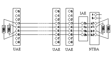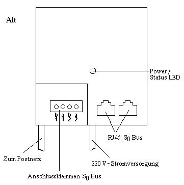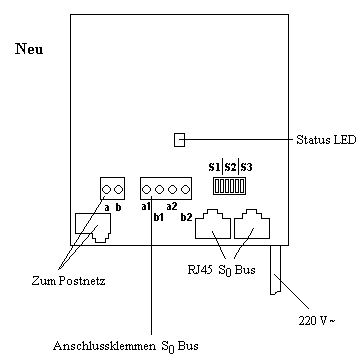 Bei neueren NTBAs leuchtet sie nur wenn die Kommunikation mit dem Postnetz aufgebaut ist. Die 220V Stromversorgung ist nur notwendig wenn ISDN Endgeräte ohne eigene Stromversorgung am S0 Bus betrieben werden (z.B. ISDN Telefon). ISDN PC Karten erhalten ihren Strom vom PC und benötigen keine Stromversorgung über das S0 Kabel. Der Anschluss zum Postnetz wird in der Regel mit einem TAE Stecker realisiert. In den beiden RJ45 Buchsen können zwei ISDN Geräte direkt betrieben werden. Ist es notwendig eine hausinterne Verkabelung durchzuführen, etwa wenn ein ISDN Telefon im Flur und eine ISDN PC Karte im Büro betrieben wird, so kann der S0 Bus über die Anschlussklemmen erweitert werden.